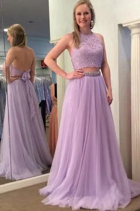 Lilac Lace Tulle Halter Neck Two Piece Prom Dress Promfy